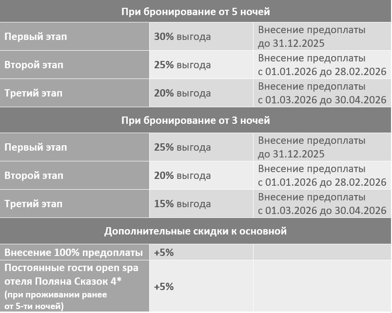 Изменение сроков и длительности пребывания в сторону увеличения согласовываются с представителем службы бронирования open SPA отеля Поляна Сказок 4*, Ялта. Изменение категории номера или коттеджа-сруба по окончанию действия акции осуществляется по предварительному согласованию и при наличии такой возможности в отеле.