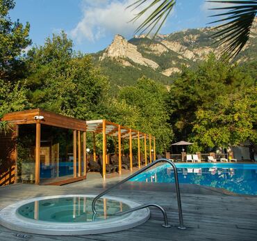 Открытый панорамный бассейн наполнен родниковой водой горных рек. Круглый год вода в бассейне подогревается до ≈ +27 °C. Рядом с бассейном расположены акватермальные чаши с гидро и аэромассажем с температурой воды до ≈ +37,5 °C. Так же рядом с акватермальной зоной