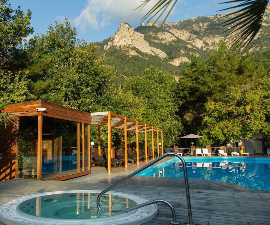 Гостиница окружена заповедником, на его территории расположен парк хвойных и лиственных деревьев. В тени вековых кедров, платанов и сосен приятно релаксировать. Любителей дальних прогулок ждут Боткинская, Штангеевская, Водопадная и Тарахташская тропы в сопровождении инструктора.