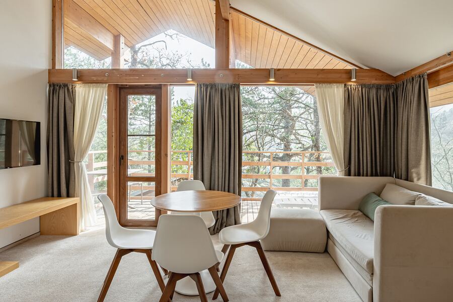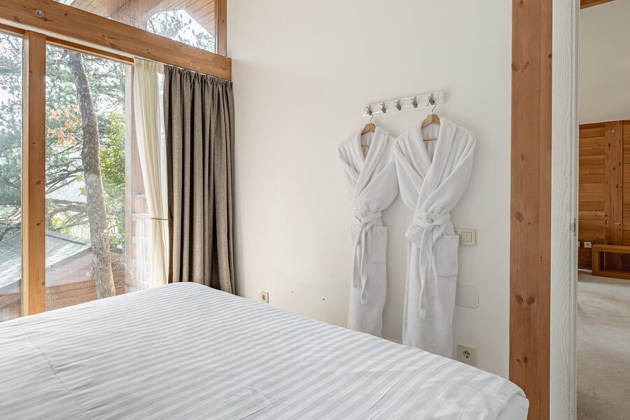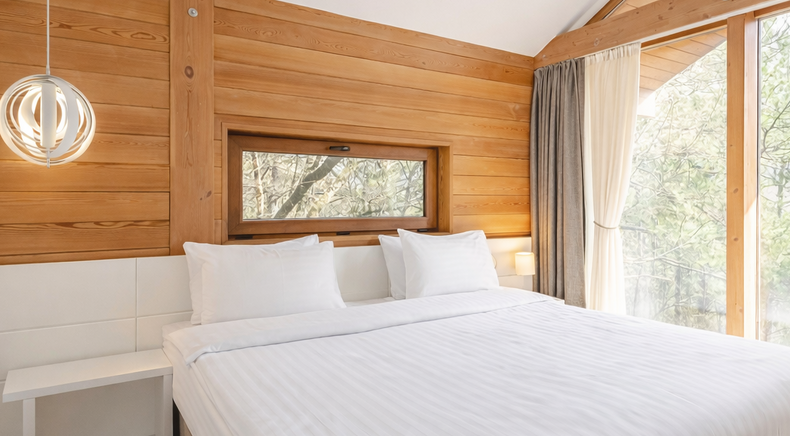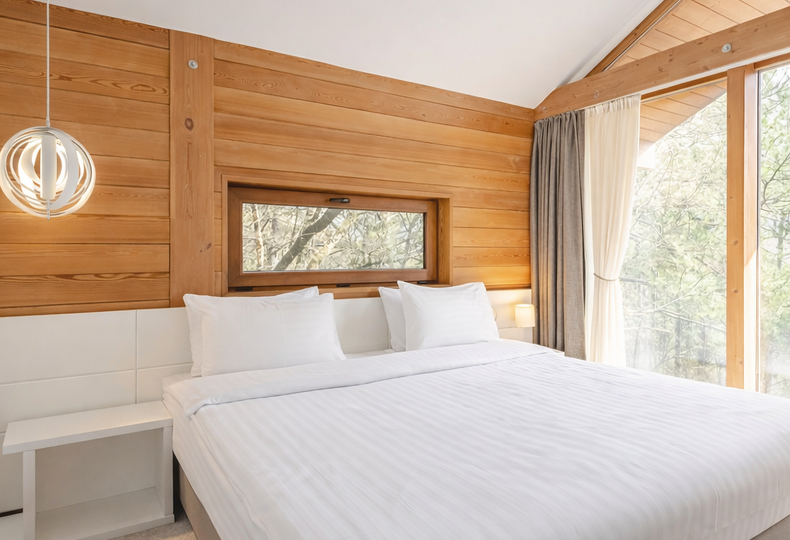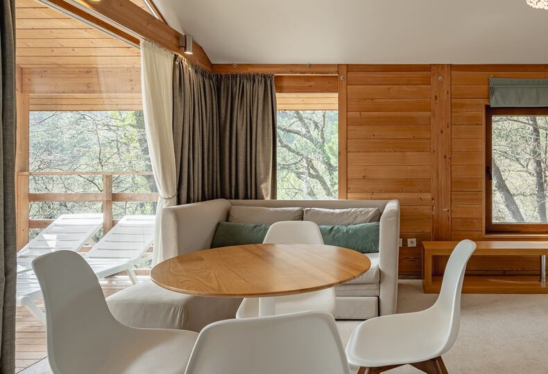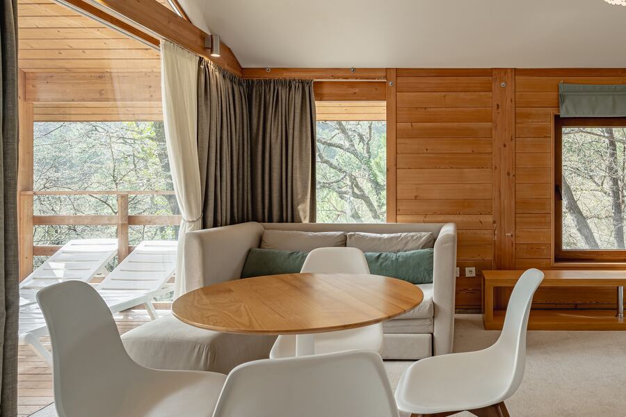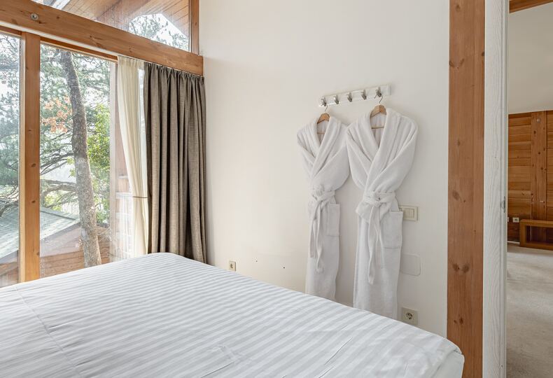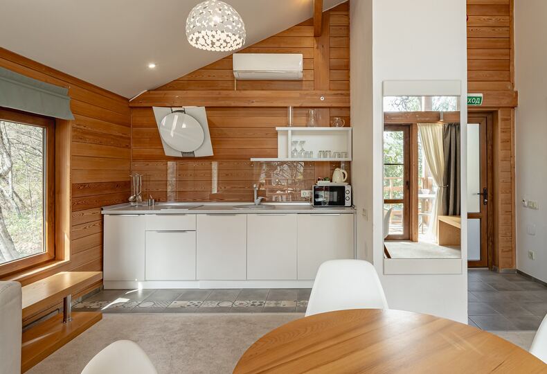 Площадь коттеджа – 47 кв. м. Здесь есть спальня, гостиная, кухня-студио и терраса. В спальне – комфортная двуспальная кровать с прикроватными тумбочками. В гостиной – раскладной двухместный диван, шкаф, холодильник, телевизор, столик со стульями. При заселении с малышом до двух лет вам бесплатно предоставят детскую кроватку с постельными принадлежностями.