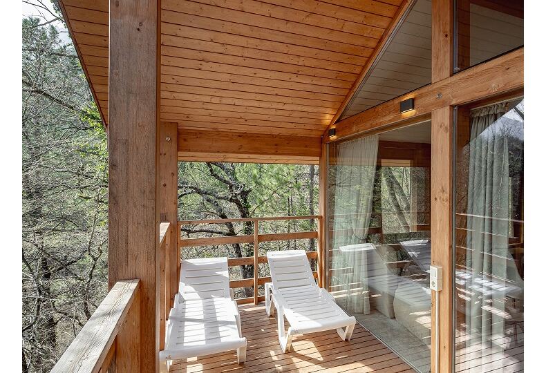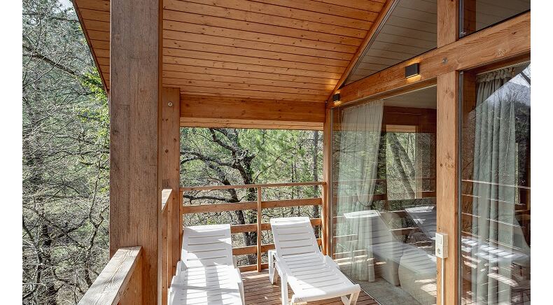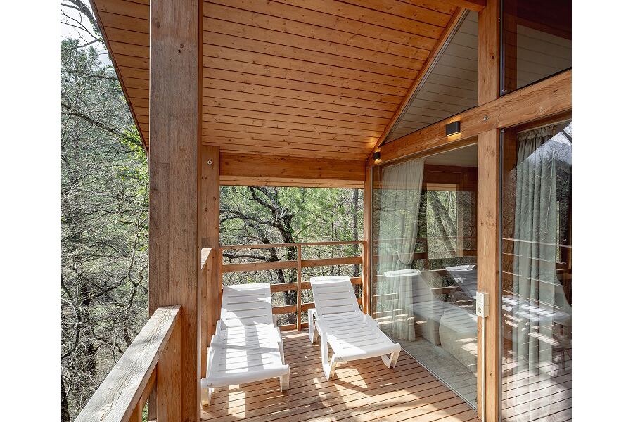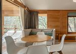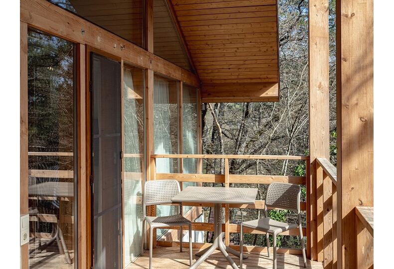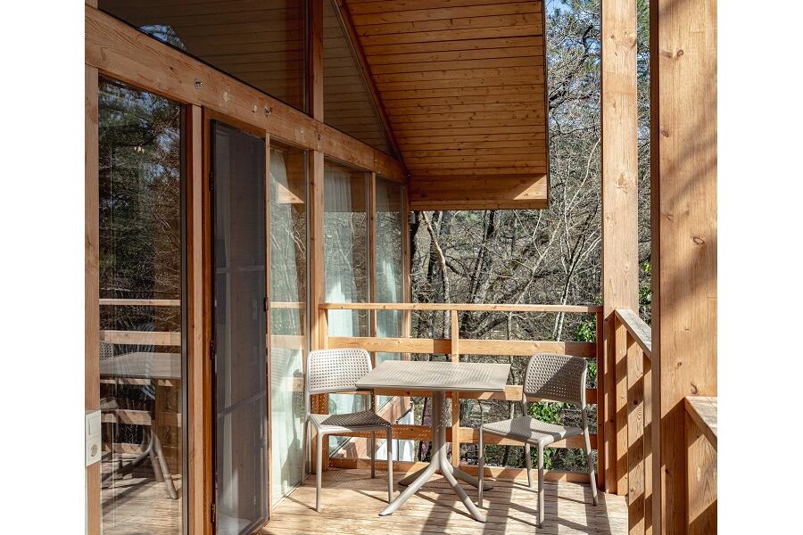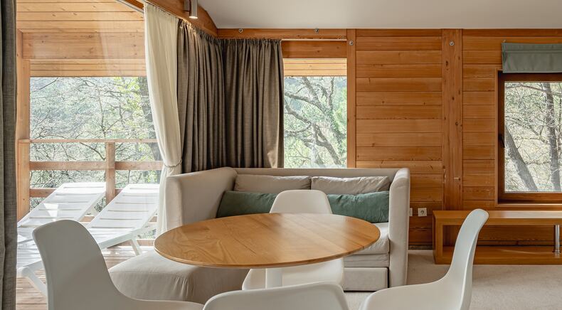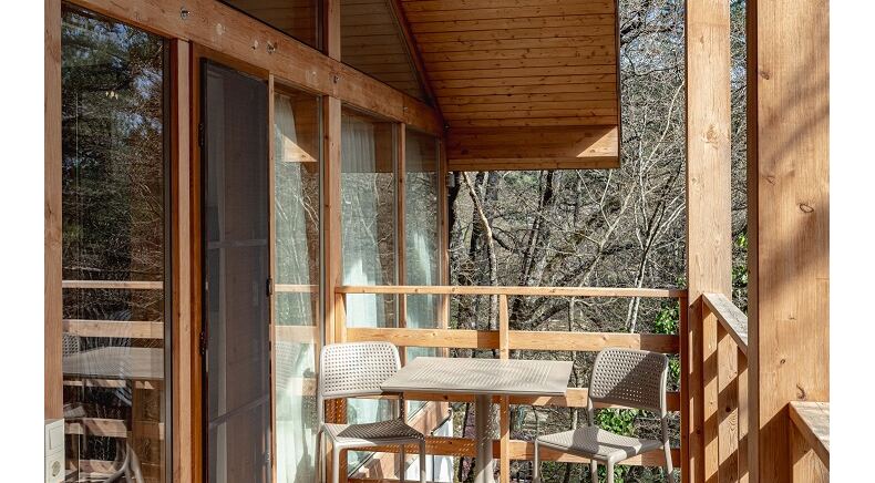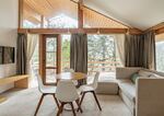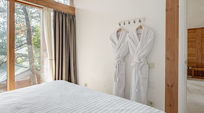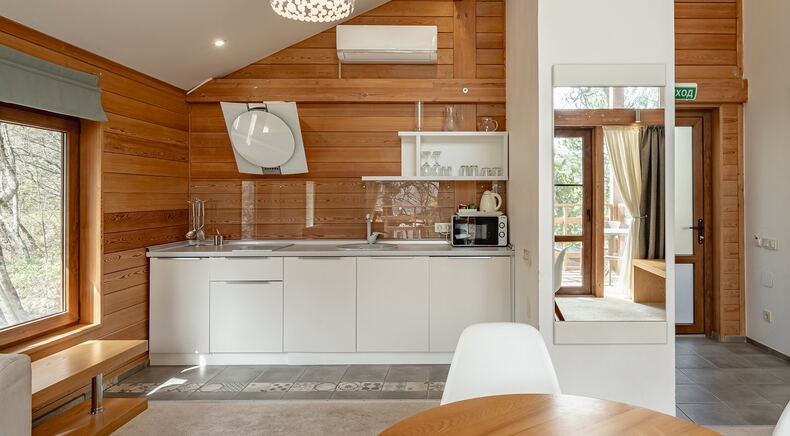 Площадь коттеджа – 47 кв. м. Здесь есть спальня, гостиная, кухня-студио и терраса. В спальне – комфортная двуспальная кровать с прикроватными тумбочками. В гостиной – раскладной двухместный диван, шкаф, холодильник, телевизор, столик со стульями. При заселении с малышом до двух лет вам бесплатно предоставят детскую кроватку с постельными принадлежностями.